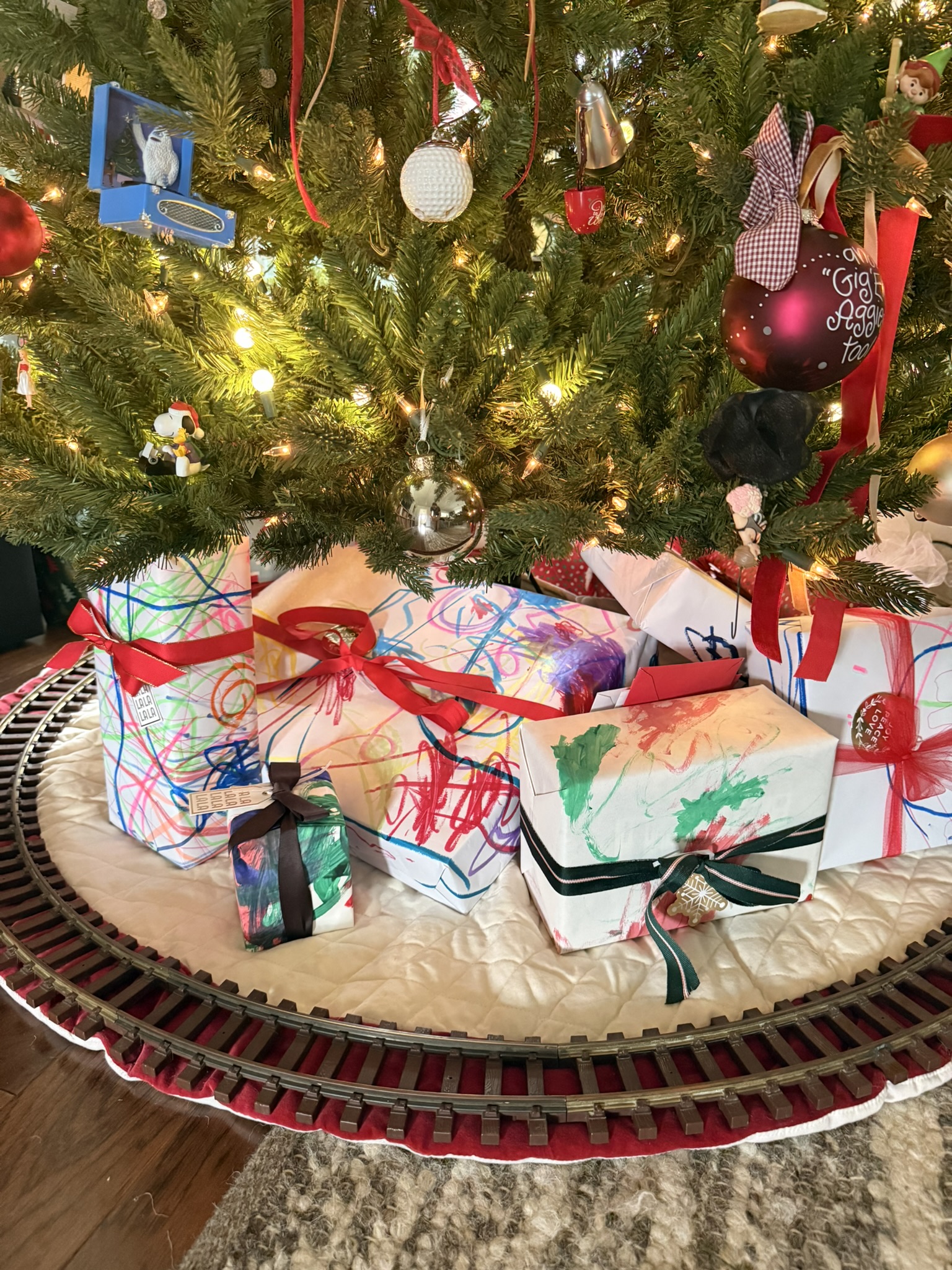 I’ve been rolling up all of Bonnie’s art easel paper and using it as wrapping paper—for birthday gifts, Christmas presents, all of it. It gives her art a second life and brings a little whimsy back into the holidays. Bonus: less gift wrap purchasing.