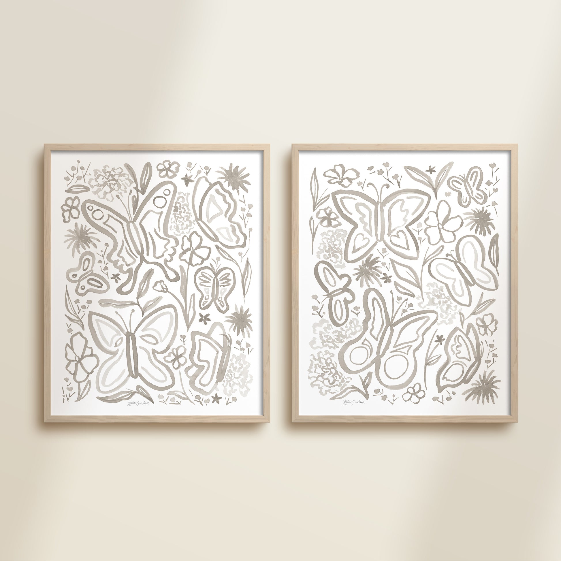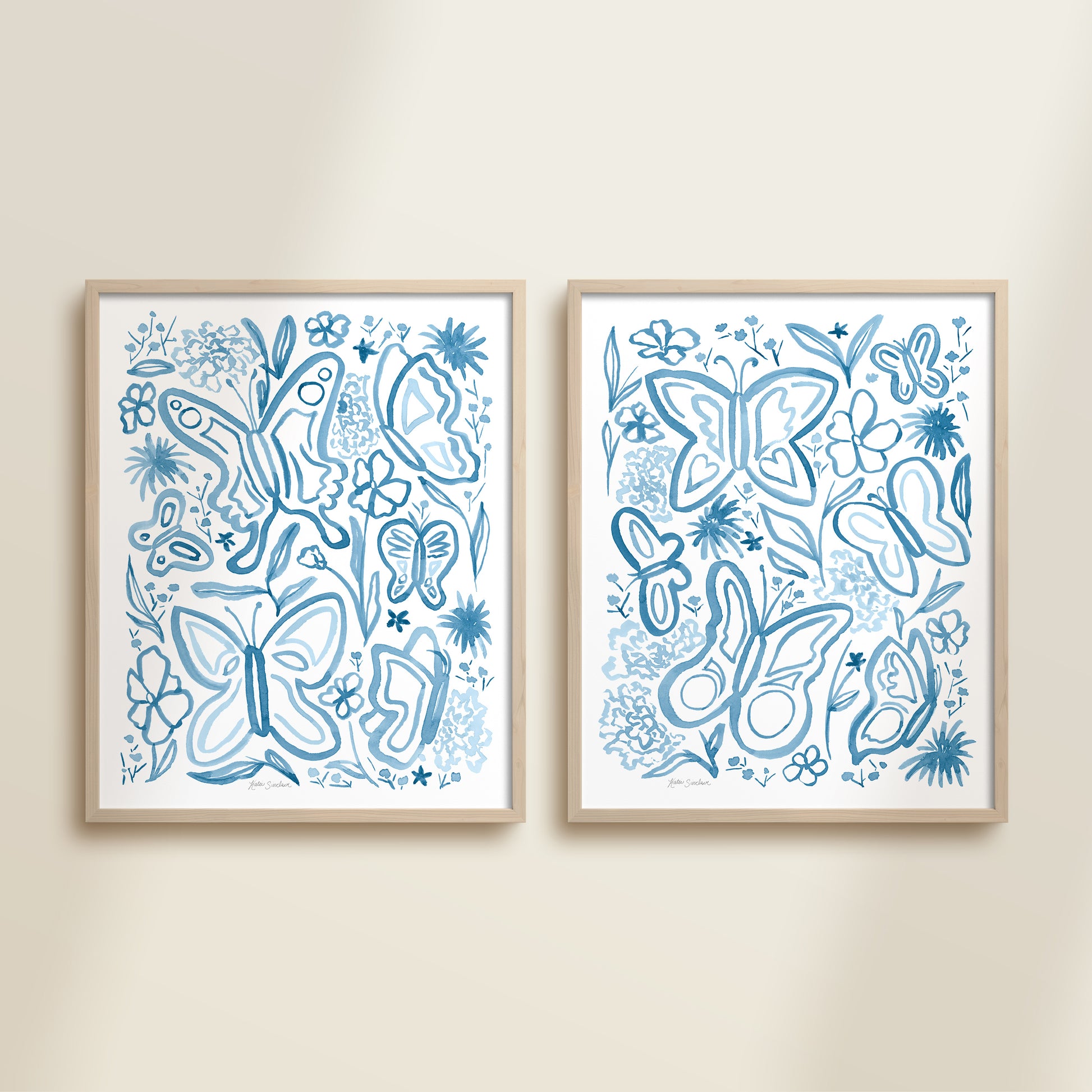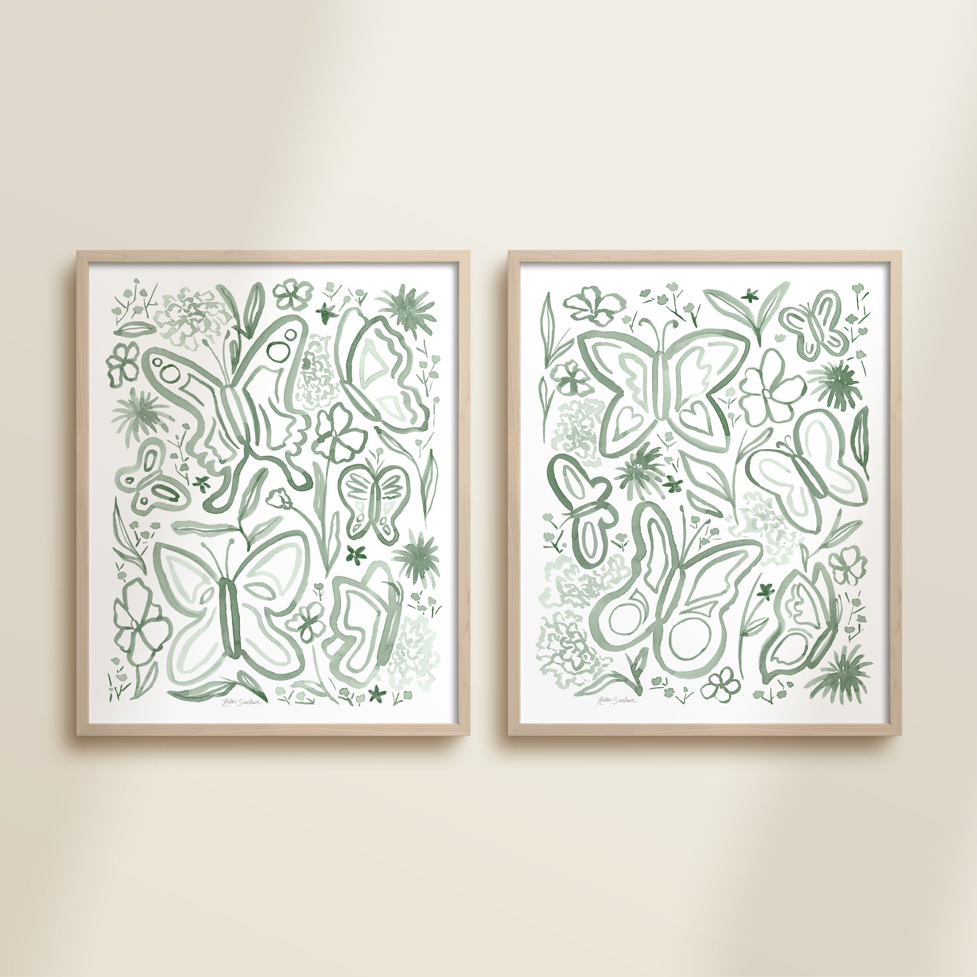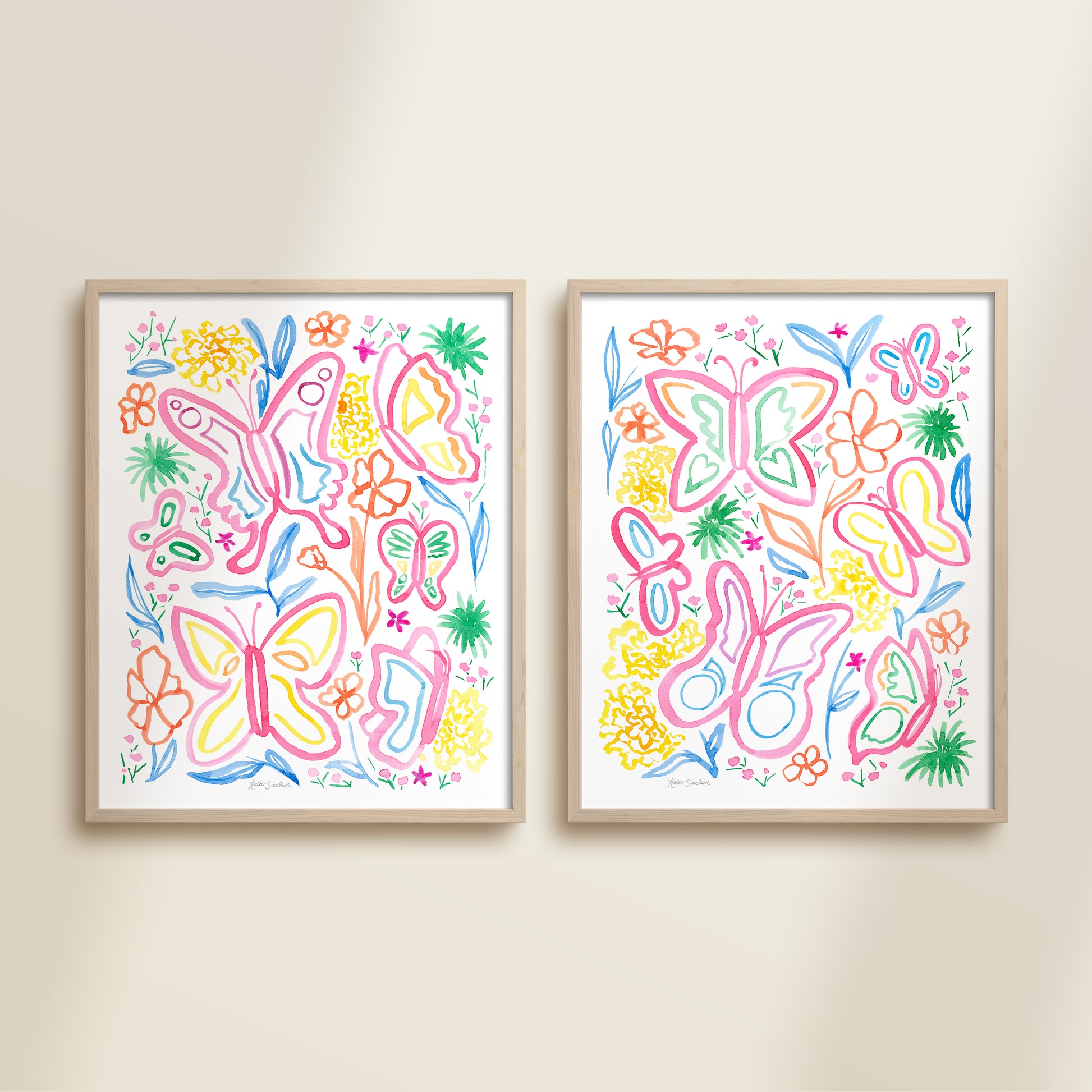 A set of two art prints: Butterfly Oasis & Butterfly Garden brings delicate watercolor butterflies and vibrant flowers to your child’s room. Archival print on smooth 300gsm paper.