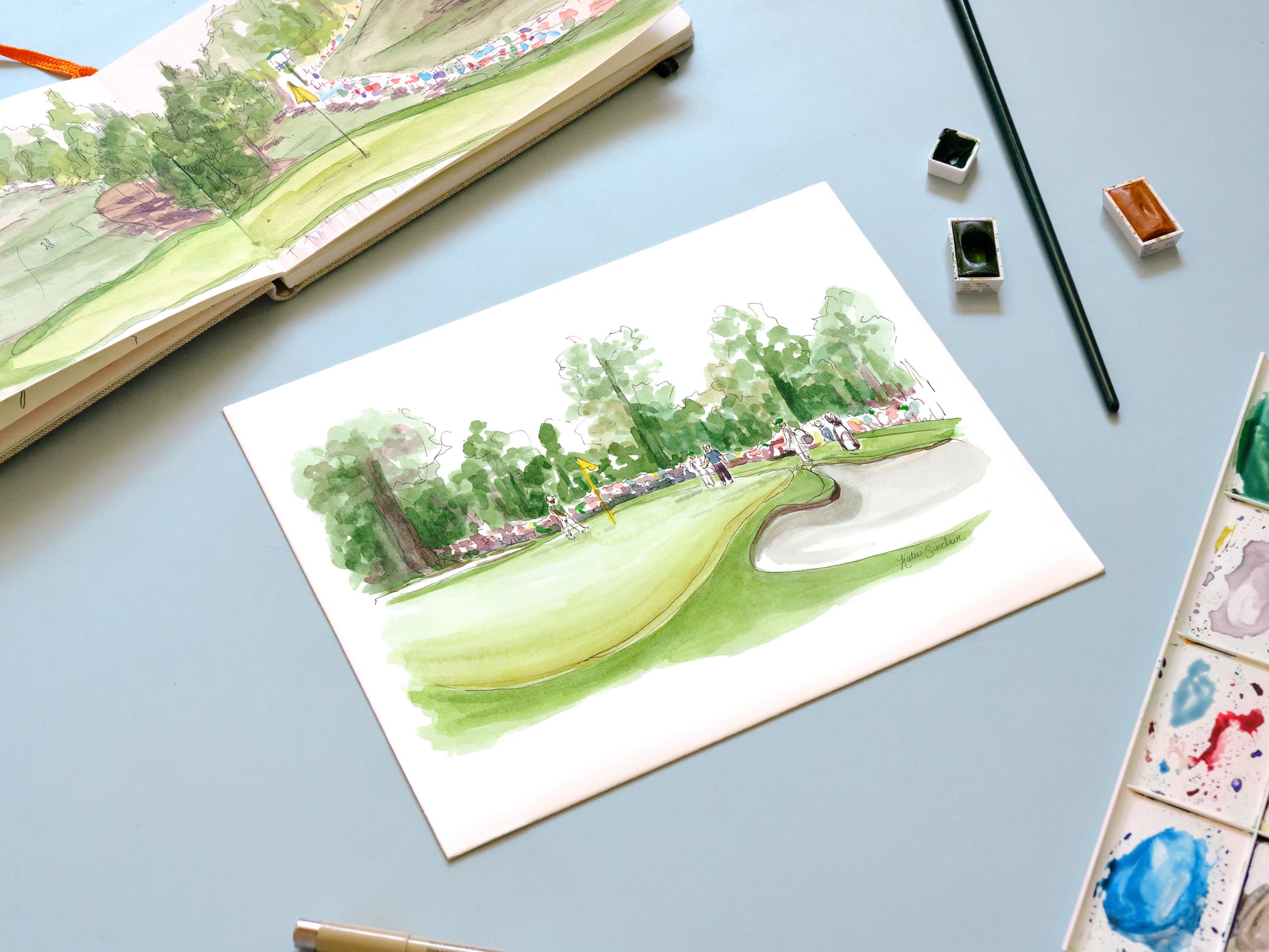This watercolor sketch was created on-site at the 2019 Masters. Pampas, hole 7 at the Masters.