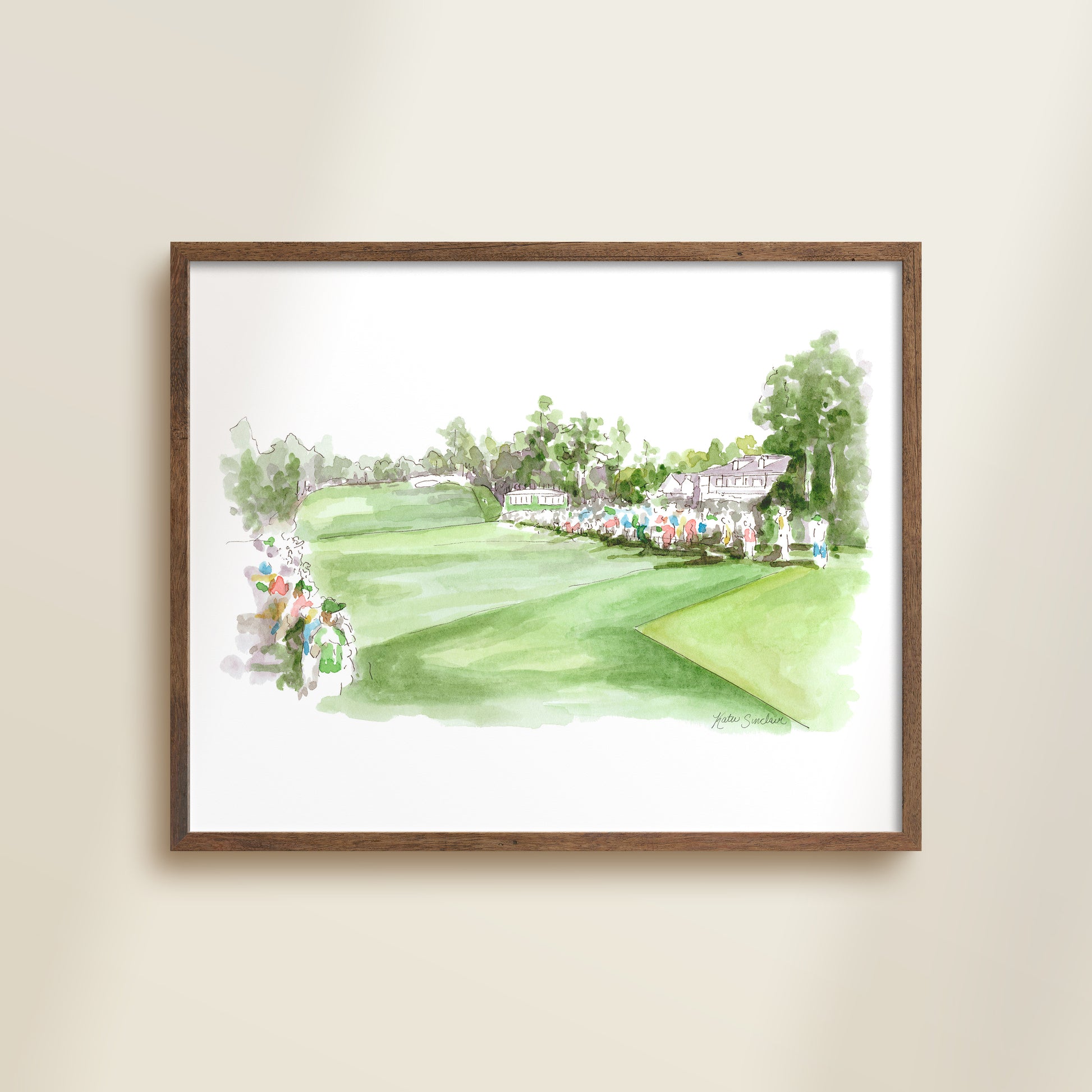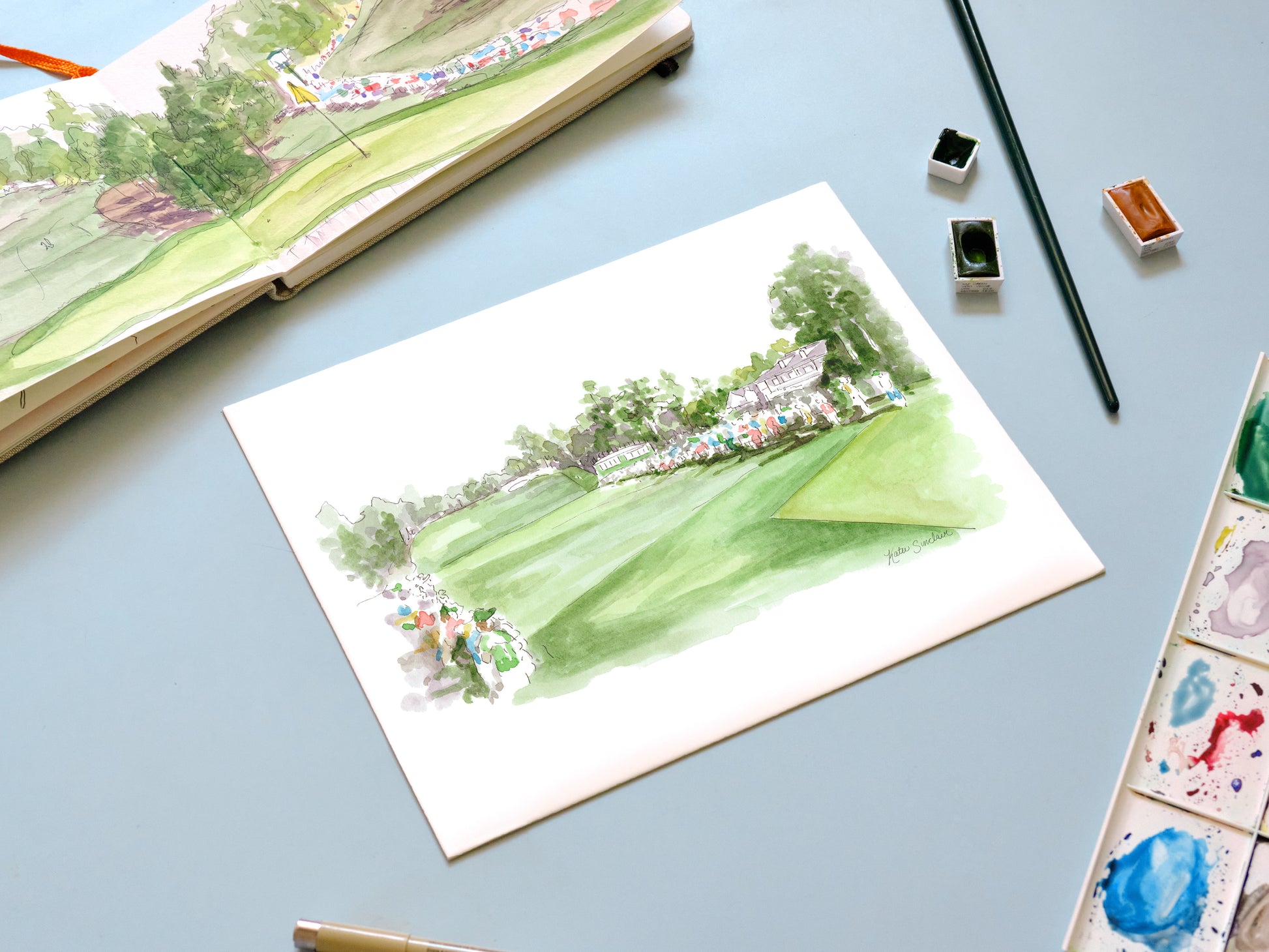 This watercolor sketch was created from photos taken by Katie Sinclair at the 2019 Masters, Augusta National golf course. Tea Olive, the first hole of the Masters.
