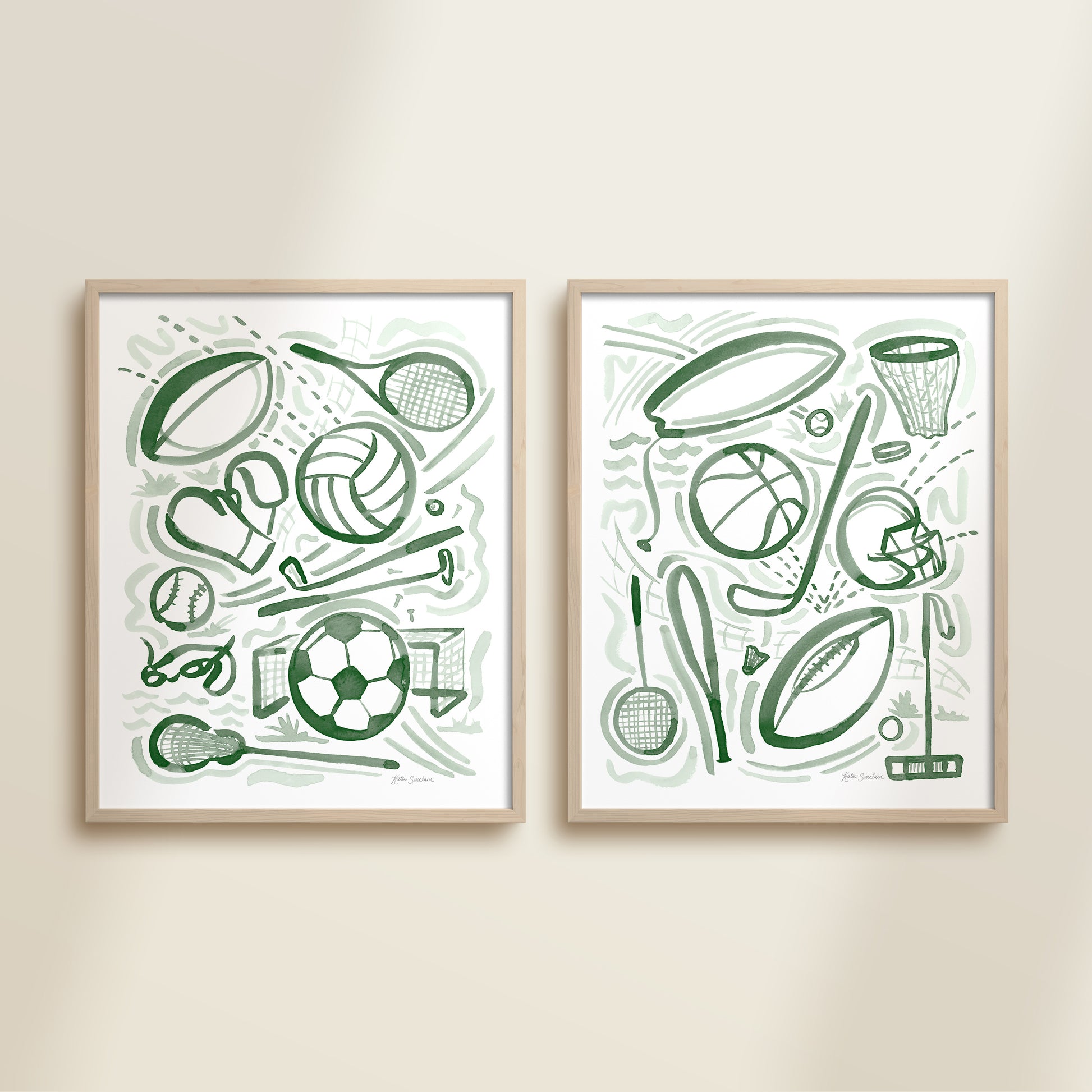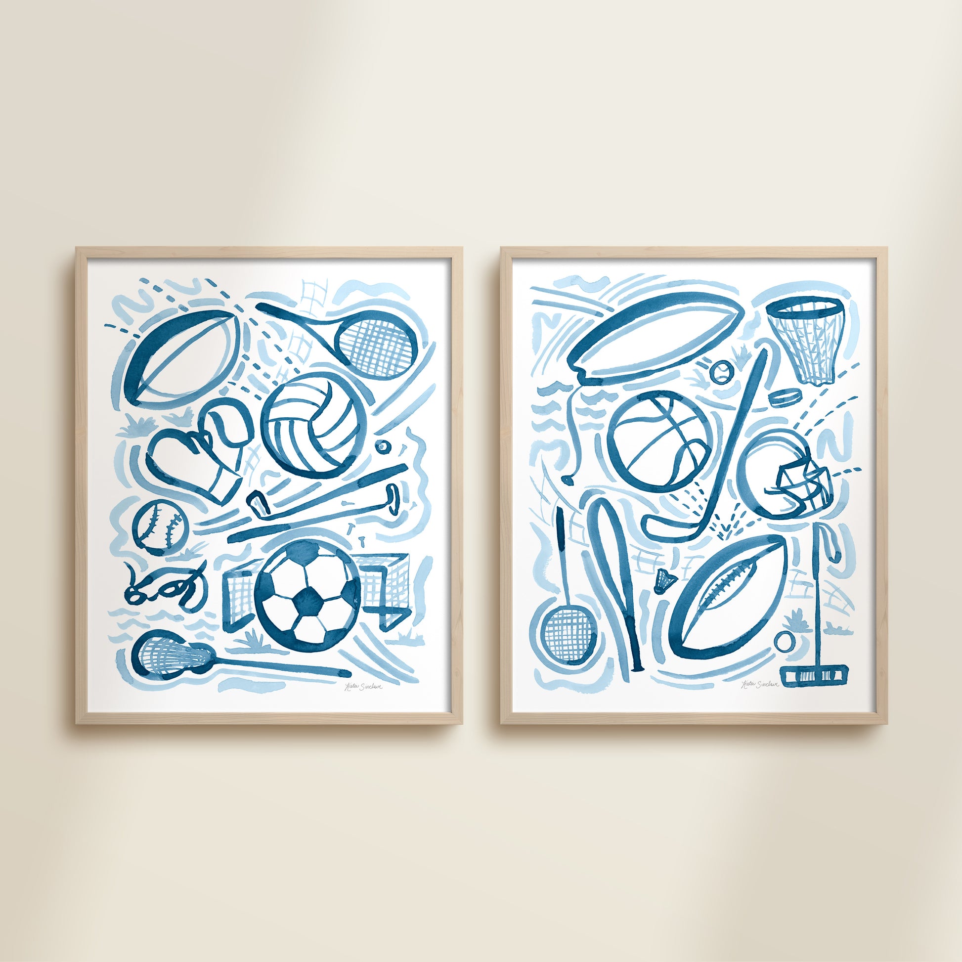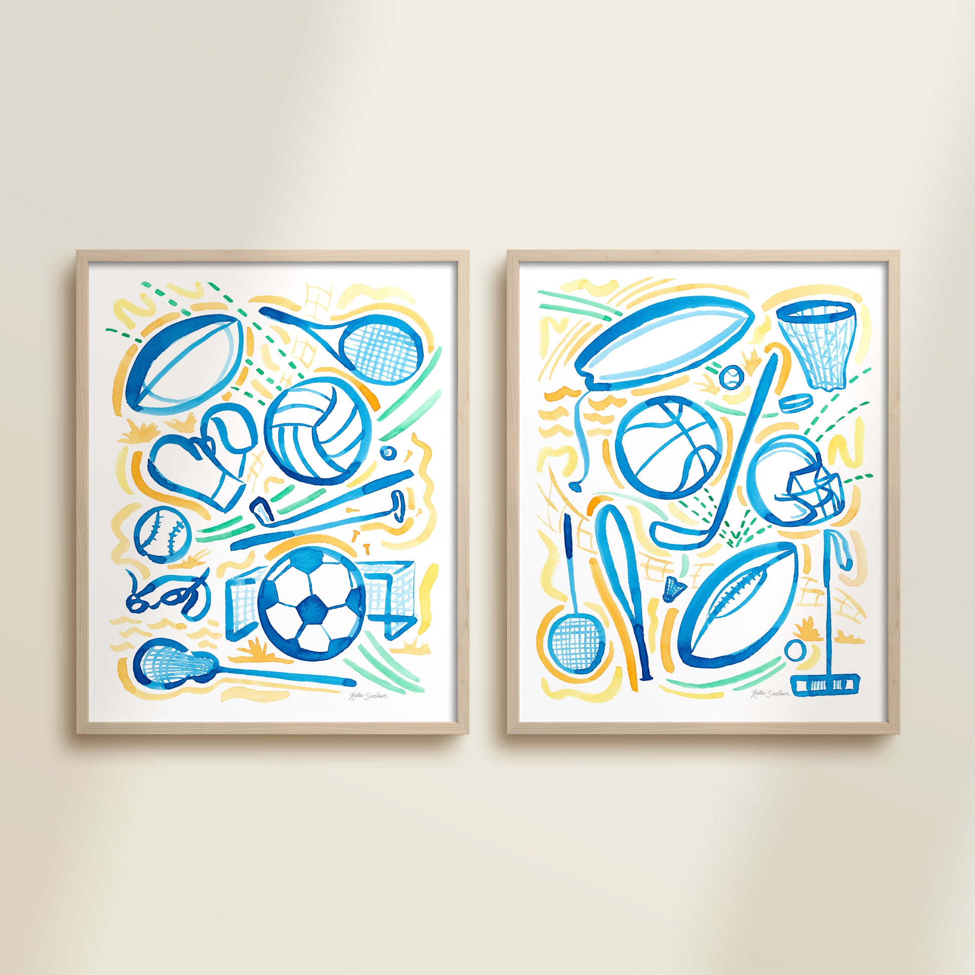 Set of two art prints: Sports No.1 & Sports No.2 is a hand-painted watercolor print set featuring traditional sports like basketball, football, surfing, polo, badminton, hockey, and baseball as well as tennis, rugby, volleyball, boxing, golf, baseball/softball, swimming, soccer, and lacrosse.