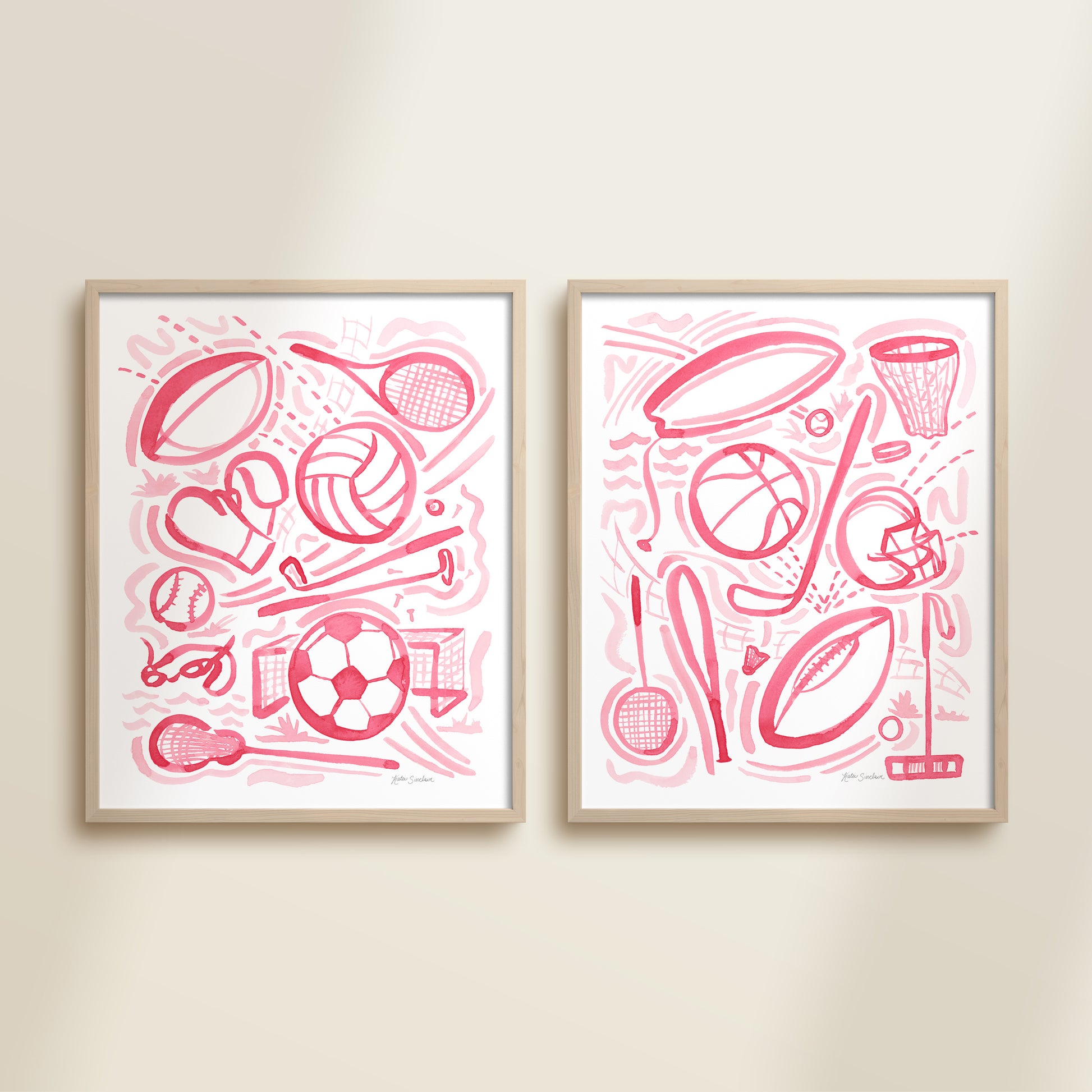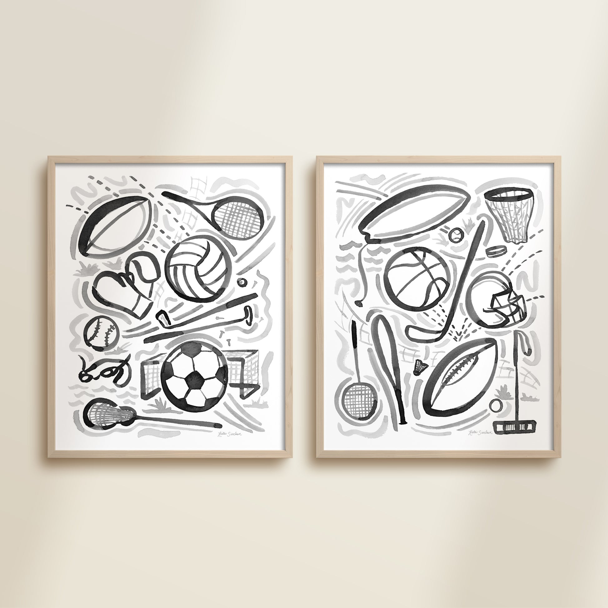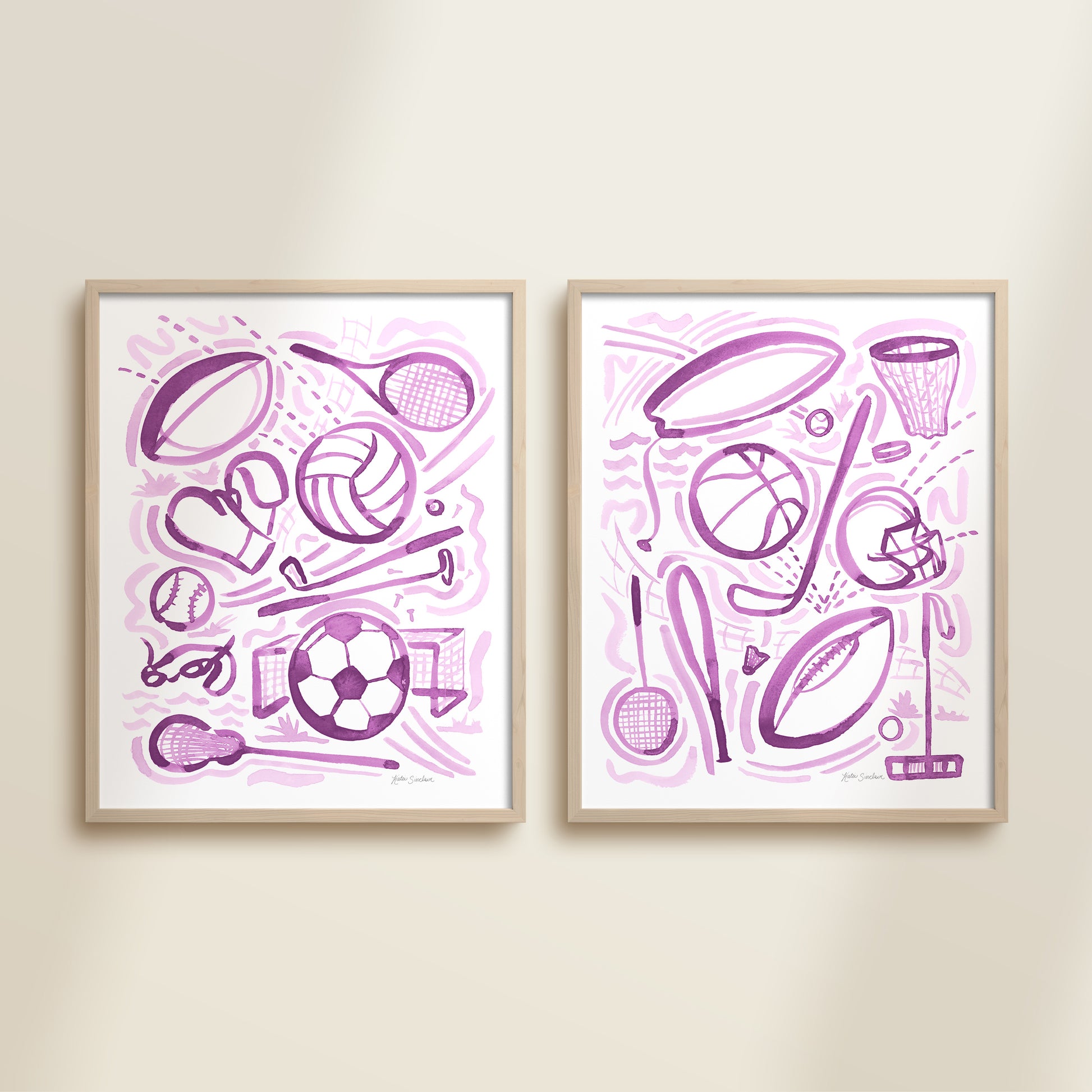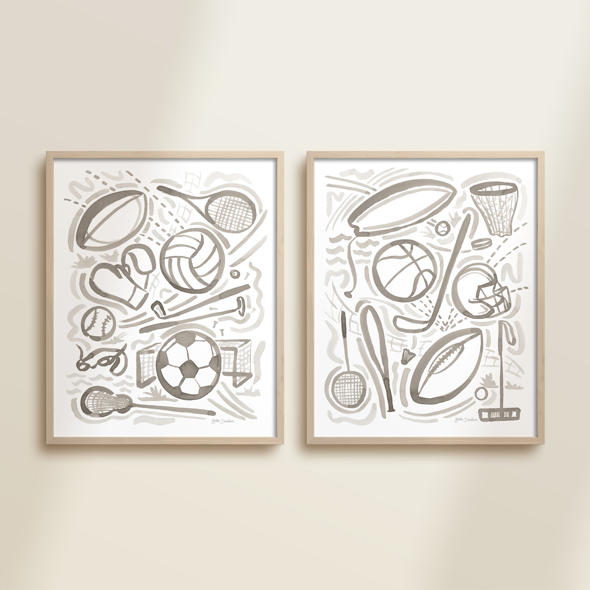 Set of two art prints: Sports No.1 & Sports No.2 is a hand-painted watercolor print set featuring traditional sports like basketball, football, surfing, polo, badminton, hockey, and baseball as well as tennis, rugby, volleyball, boxing, golf, baseball/softball, swimming, soccer, and lacrosse.